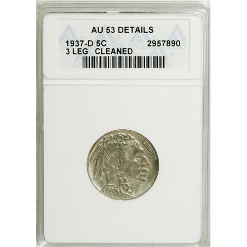<B>1937-D 5C Three-Legged--Cleaned--ANACS. AU53 Details.</B></I> A richly defined if slightly bright example of this always popular issue. A mild cleaning is hardly noticeable. The Indian's cheek has a minor lamination.<BR><I>From The Greg Southward Collection.</B></I><BR><BR><b>Shipping:</b> Coins & Currency (<a target="_blank" href="http://www.heritageauctions.com/common/shipping.php">view shipping information</a>)