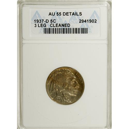 <B>1937-D 5C Three-Legged--Cleaned--ANACS. AU55 Details.</B></I> FS-020.2. Caramel-gold and olive adorn this lightly circulated key date nickel, although the highpoints are pearl-gray. Much luster remains despite a mild cleaning.<BR><BR><b>Shipping:</b> Coins & Currency (<a target="_blank" href="http://www.heritageauctions.com/common/shipping.php">view shipping information</a>)