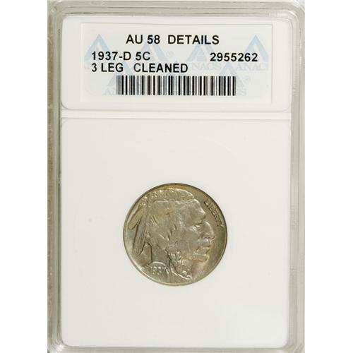 <B>1937-D 5C Three-Legged--Cleaned--ANACS. AU58 Details.</B></I> Soft blue and gold patina covers the muted surfaces of this nickel. Only a touch of friction appears on the highpoints, though the devices exhibit heavy die erosion as always.<BR><BR><b>Shipping:</b> Coins & Currency (<a target="_blank" href="http://www.heritageauctions.com/common/shipping.php">view shipping information</a>)
