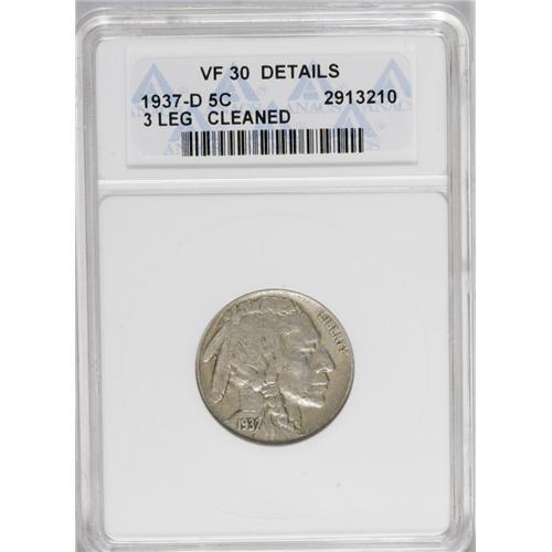 1937-D 5C Three-Legged--Cleaned--ANACS. VF30 Details.