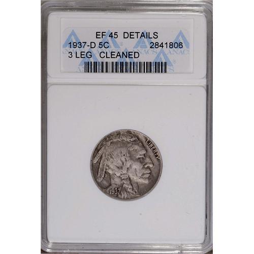 <B>1937-D<5C> Three-Legged--Cleaned--ANACS. XF45 Details.</B></I> This slate-gray example shows little indication of a cleaning, but both sides have a few lengthy hair-thin pinscratches that are only visible beneath a glass. <BR><BR><B>Important notice:</B> Heritage usually auctions material at the rate of 200-250 lots per hour. On some occasions eBay Live bid software or the Internet may not be able to keep up with the pace of the auction. We recommend placing a realistic absentee bid now as insurance to avoid disappointment. Occasionally the auctioneer may eliminate or reject an eBay Live bid, and the auctioneer may also reopen a lot after the close of the eBay live bidding (usually because we missed an audience bid), and may reject your bid even if it shows you as the winning bidder. By bidding via eBay Live, you agree that Heritage may award the lot to another bidder at its sole discretion under the circumstances described above or any other reasonable circumstances. Since eBay bids are not shown to us until we open the lot on the floor, we treat those bids just like floor bids. In most cases the floor responds before the eBay bid is presented to us, due to Internet lag time, so for consistency we have made it a policy that floor bids are always considered first over tie eBay live bids. Also please note that all Heritage lots purchased through eBay Live carry a 20% Buyer's Premium. Please make sure you read the Terms and Conditions before you bid. This lot is being auctioned in conjunction with a live floor auction by Heritage Galleries & Auctioneers. All final auction and invoice information will be supplied by Heritage Galleries & Auctioneers, and all other information should be considered preliminary. Lot:1130 <BR><BR><B>Winning Notification and Billing:</B> After the FINAL session in this auction is complete, Heritage will send e-mail and snail mail invoices. This process normally takes several days. All final auction and invoice information will be supplied by Heritage Galleries & Auctioneers, and all other information should be considered preliminary. <BR><BR>This auction will be conducted on a live auction floor and over the Internet through eBay Live. If you choose to place an absentee bid, please take a moment to <font color='#0000ff'><u><a href='http://pages.ebay.com/liveauctions/help/before/laabsentee.html'>learn how eBay Live absentee bidding works</a></u></font><font color='#000000'>