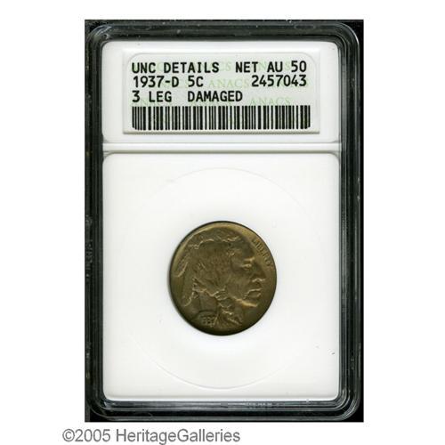 1937-D 5C Three-Legged--Damaged--ANACS. Unc Details, 1937-D[5C] Three-Legged--Damaged--ANACS. Unc De