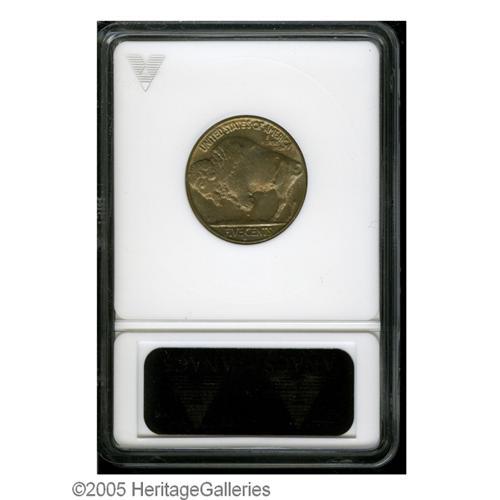 <B>1937-D<5C> Three-Legged--Damaged--ANACS. Unc Details, Net AU50.</B></I> Rose, olive, and gray colors embrace this sharp and shimmering example. Although not apparent at first glance, abrasions on the Native American's brow and the bison's hump explain the ANACS annotation.