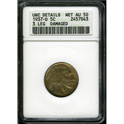 <B>1937-D<5C> Three-Legged--Damaged--ANACS. Unc Details, Net AU50.</B></I> Rose, olive, and gray colors embrace this sharp and shimmering example. Although not apparent at first glance, abrasions on the Native American's brow and the bison's hump explain the ANACS annotation. <BR><BR><B>Important notice:</B> Heritage usually auctions material at the rate of 200-250 lots per hour. On some occasions eBay Live bid software or the Internet may not be able to keep up with the pace of the auction. We recommend placing a realistic absentee bid now as insurance to avoid disappointment. Occasionally the auctioneer may eliminate or reject an eBay Live bid, and the auctioneer may also reopen a lot after the close of the eBay live bidding (usually because we missed an audience bid), and may reject your bid even if it shows you as the winning bidder. By bidding via eBay Live, you agree that Heritage may award the lot to another bidder at its sole discretion under the circumstances described above or any other reasonable circumstances. Since eBay bids are not shown to us until we open the lot on the floor, we treat those bids just like floor bids. In most cases the floor responds before the eBay bid is presented to us, due to Internet lag time, so for consistency we have made it a policy that floor bids are always considered first over tie eBay live bids. Also please note that all Heritage lots purchased through eBay Live carry a 20% Buyer's Premium. Please make sure you read the Terms and Conditions before you bid. This lot is being auctioned in conjunction with a live floor auction by Heritage Galleries & Auctioneers. All final auction and invoice information will be supplied by Heritage Galleries & Auctioneers, and all other information should be considered preliminary. Lot:1132 <BR><BR><B>Winning Notification and Billing:</B> After the FINAL session in this auction is complete, Heritage will send e-mail and snail mail invoices. This process normally takes several days. All final auction and invoice information will be supplied by Heritage Galleries & Auctioneers, and all other information should be considered preliminary. <BR><BR>This auction will be conducted on a live auction floor and over the Internet through eBay Live. If you choose to place an absentee bid, please take a moment to <font color='#0000ff'><u><a href='http://pages.ebay.com/liveauctions/help/before/laabsentee.html'>learn how eBay Live absentee bidding works</a></u></font><font color='#000000'>