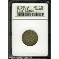 1937-D 5C Three-Legged--Damaged--ANACS. VF Details, <B>1937-D 5C Three-Legged--Damaged--ANACS. VF Details, Net Fine 12.</B></I> A couple of minor scratches are seen on the bison, otherwise the medium gray surfaces are sharp and attractive. An excellent mid-grade example of this popular key coin. <BR><BR><B>Important notice:</B> Heritage usually auctions material at the rate of 200-250 lots per hour. On some occasions eBay Live bid software or the Internet may not be able to keep up with the pace of the auction. We recommend placing a realistic absentee bid now as insurance to avoid disappointment. Occasionally the auctioneer may eliminate or reject an eBay Live bid, and the auctioneer may also reopen a lot after the close of the eBay live bidding (usually because we missed an audience bid), and may reject your bid even if it shows you as the winning bidder. By bidding via eBay Live, you agree that Heritage may award the lot to another bidder at its sole discretion under the circumstances described above or any other reasonable circumstances. Since eBay bids are not shown to us until we open the lot on the floor, we treat those bids just like floor bids. In most cases the floor responds before the eBay bid is presented to us, due to Internet lag time, so for consistency we have made it a policy that floor bids are always considered first over tie eBay live bids. Also please note that all Heritage lots purchased through eBay Live carry a 20% Buyer's Premium. Please make sure you read the Terms and Conditions before you bid. This lot is being auctioned in conjunction with a live floor auction by Heritage Galleries & Auctioneers. All final auction and invoice information will be supplied by Heritage Galleries & Auctioneers, and all other information should be considered preliminary. Lot:5607