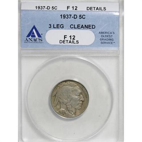 <B>1937-D 5C Three-Legged Fine--Cleaned--ANACS. Fine 12 Details.</B></I> An olive-gray representative of this eagerly pursued variety, a mainstay of the <I>Guide Book</B></I> for generations. The devices exhibit a few faint hairlines, but many collectors will ignore them as appropriate for the Fine 12 level.<BR><BR><B>Coin Engraver:</B> James E. Fraser<BR><BR><b>Shipping:</b> Coins & Currency (<a target="_blank" href="http://www.heritageauctions.com/common/shipping.php">view shipping information</a>)