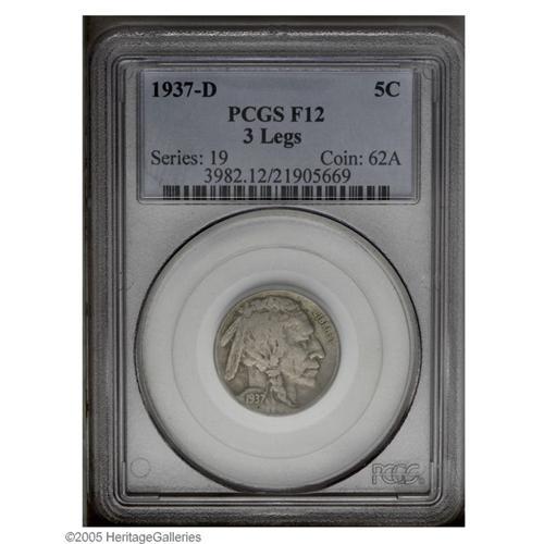 <B>1937-D<5C> Three-Legged Fine 12 PCGS.</B></I> A pleasing and affordable example of this vastly popular error. One diagonal mark, while not detracting from the appeal, is noted running across the bison's belly.