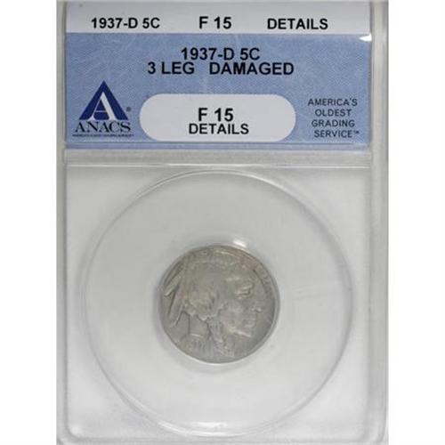 <B>1937-D 5C Three-Legged--Damaged--ANACS. Fine 15 Details.</B></I> This key date nickel has a short obverse scratch at 3:30, and small portions of the nostril and lip are blunted. All four date digits are clear.<BR><BR><B>Coin Engraver:</B> James E. Fraser<BR><BR><b>Shipping:</b> Coins & Currency (<a target="_blank" href="http://www.heritageauctions.com/common/shipping.php">view shipping information</a>)