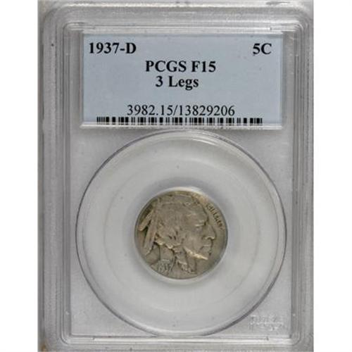 <B>1937-D 5C Three-Legged Fine 15 PCGS.</B></I> FS-020.2. The date and mintmark are bold, and the slate-gray surfaces are lightly abraded for the grade. A collectible example of this eternally popular <I>Guide Book</B></I> variety.<BR><BR><B>Coin Engraver:</B> James E. Fraser<BR><BR><b>Shipping:</b> Coins & Currency (<a target="_blank" href="http://www.heritageauctions.com/common/shipping.php">view shipping information</a>)