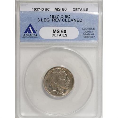 <B>1937-D 5C Three-Legged--Reverse Cleaned--ANACS. MS60 Details. </B></I> Well struck and free of contact marks or abrasions, this is actually a very nice example of the famous Three-Legged Buffalo nickel, despite the ANACS caveat. Lustrous with light olive-gold toning. Any adverse effects from the purported reverse cleaning are too subtle to reduce the eye appeal of the piece. <BR><BR><B>Coin Engraver:</B> James E. Fraser<BR><BR><b>Shipping:</b> Coins & Currency (<a target="_blank" href="http://www.heritageauctions.com/common/shipping.php">view shipping information</a>)