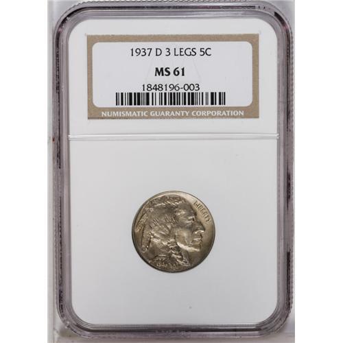 <B>1937-D<5C> Three-Legged MS61 NGC.</B></I> A sharply struck example of this scarce mint error. Slightly subdued mint luster with a few smaller surface marks and pale rose-golden color. Difficult to locate as an Uncirculated specimen.