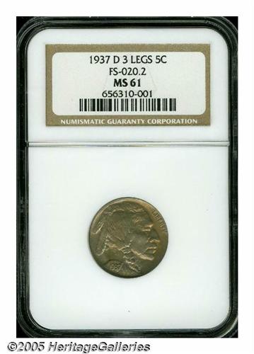 <B>1937-D<5C> Three-Legged MS61 NGC.</B></I> FS-020.2. An attractive example of this popular variety. The present example features tangerine toning, with streaks of red and no singularly notable contact marks.