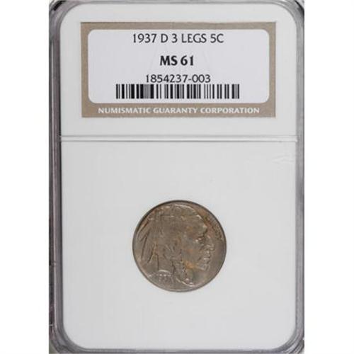 <B>1937-D 5C Three-Legged MS61 NGC.</B></I> John Wexler et al (2007), write that: "The rarity of this coin is almost always overstated. It is not rare, or for that matter, even scarce. Thousands exist. The high values are the result of very high demand." The above statement notwithstanding, it is expected that this MS61 will bring about spirited bidding. Glowing surfaces display pleasing golden-gray patina that exhibit well struck devices, save for minor softness in the hair on the bison's head. A few unobtrusive marks do not disturb. A nice piece for the grade designation.<BR><BR><b>Shipping:</b> Coins & Currency (<a target="_blank" href="http://www.heritageauctions.com/common/shipping.php">view shipping information</a>)