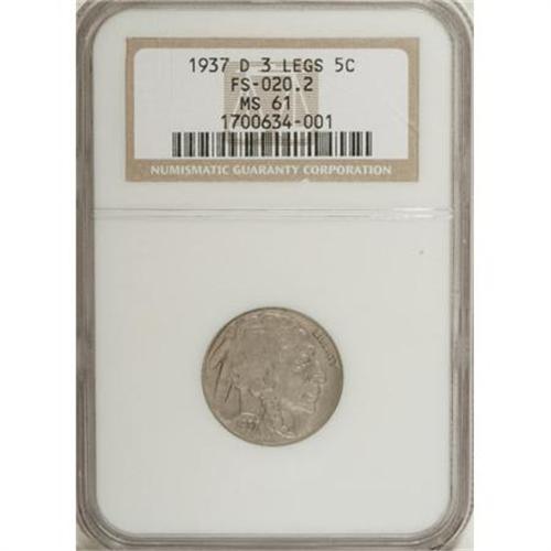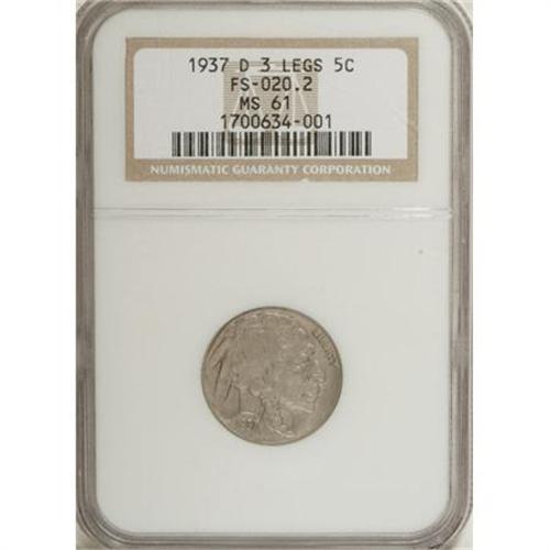 <B>1937-D 5C Three-Legged MS61 NGC.</B></I> FS-020.2 The 1937-D Three-Leg nickel, according to David Lange (2000), " ... was evidently discovered by, or at least first publicized by, C.L. 'Cowboy' Franzen. He was advertising them for sale in <I>The Numismatic Scrapbook Magazine</B></I> as early as 1937-38." The MS61 specimen offered in this lot exhibits light to medium gray toning with red-gold accents. The design elements are generally well impressed, though there is minor softness in the hair at the bison's forehead. The date, LIBERTY, the horn, and mintmark are sharp. All in all, a very pleasing example for the grade, that is perhaps somewhat conservative.<BR><BR><b>Shipping:</b> Coins & Currency (<a target="_blank" href="http://www.heritageauctions.com/common/shipping.php">view shipping information</a>)
