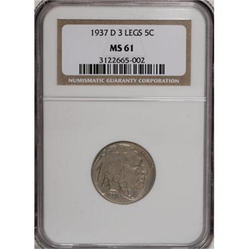 <B>1937-D 5C Three-Legged MS61 NGC.</B></I> A thin coat of golden-tan patina laced with wisps of lavender and sky-blue adheres to both sides of this popular variety, and sharp definition is seen on the design features. A minute buildup of foreign material is visible behind the Indian's neck, and a few light handling marks are scattered about.<BR><BR><B>Coin Engraver:</B> James E. Fraser<BR><BR><b>Shipping:</b> Coins & Currency (<a target="_blank" href="http://www.heritageauctions.com/common/shipping.php">view shipping information</a>)