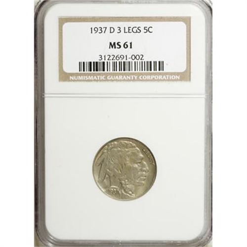 <B>1937-D 5C Three-Legged MS61 NGC.</B></I> Bold details and satiny surfaces allow the devices to stand against the fields in a medallic appearance. Light champagne toning is evident on both sides. The famous Three-Legged Buffalo has been a favorite with collectors ever since it was first recorded in the <I>Guide Book</B></I>.<BR><BR><B>Coin Engraver:</B> James E. Fraser<BR><BR><b>Shipping:</b> Coins & Currency (<a target="_blank" href="http://www.heritageauctions.com/common/shipping.php">view shipping information</a>)