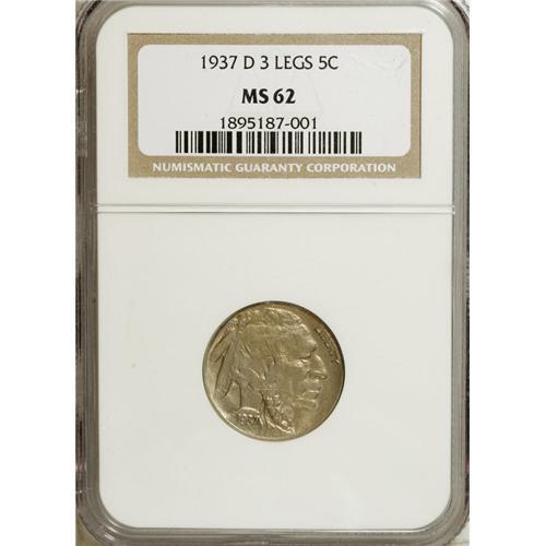 <B>1937-D 5C Three-Legged MS62 NGC.</B></I> An unworn example of this in-demand variety, subtly lustrous beneath green-gold and peach patina. Minimally marked for the grade with only a handful of abrasions on the reverse. An early die state piece, with fragments of the foreleg still visible and the raised lumps below the bison still soft.<BR><BR><b>Shipping:</b> Coins & Currency (<a target="_blank" href="http://www.heritageauctions.com/common/shipping.php">view shipping information</a>)