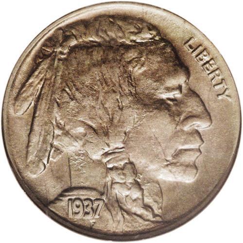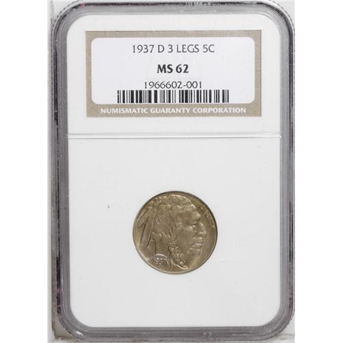 <B>1937-D<5C> Three-Legged MS62 NGC.</B></I> FS-020.2. Glossy and primarily gunmetal-gray in color with flashes of apricot and steel-blue color in the recesses of the design. This year's September Long Beach sale features the usual fine selection of this ever-popular Buffalo nickel variety.