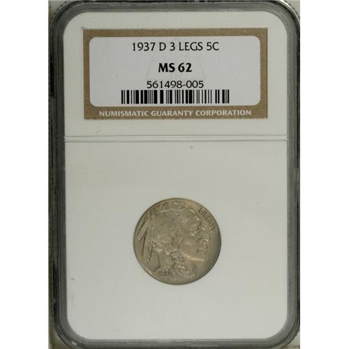 <B>1937-D 5C Three-Legged MS62 NGC.</B></I> Natural steely-gray surfaces are satiny in appearance and display tinges of golden patina in the areas surrounding the devices. Although the luster on this popular 20th century variety is typically subdued, the originality of the coin is a bonus for those who appreciate such things.<BR><BR><b>Shipping:</b> Coin/Currency (<a target="_blank" href="http://www.heritageauctions.com/common/shipping.php">view shipping information</a>)