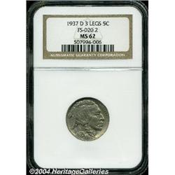 <B>1937-D<5C> Three-Legged MS62 NGC.</B></I> FS-020.2. A shimmering silver-gray representative that is devoid of carbon and has only an infrequent trivial contact mark. The trail of raised die lumps in the field below the bison's flank is diagnostic for this popular die variety, which is more often encountered in impaired VF and XF grades. Always a frequent attendee of dealers' want lists. <BR><BR><B>Important notice:</B> Heritage usually auctions material at the rate of 200-250 lots per hour. On some occasions eBay Live bid software or the Internet may not be able to keep up with the pace of the auction. We recommend placing a realistic absentee bid now as insurance to avoid disappointment. Occasionally the auctioneer may eliminate or reject an eBay Live bid, and the auctioneer may also reopen a lot after the close of the eBay live bidding (usually because we missed an audience bid), and may reject your bid even if it shows you as the winning bidder. By bidding via eBay Live, you agree that Heritage may award the lot to another bidder at its sole discretion under the circumstances described above or any other reasonable circumstances. Since eBay bids are not shown to us until we open the lot on the floor, we treat those bids just like floor bids. In most cases the floor responds before the eBay bid is presented to us, due to Internet lag time, so for consistency we have made it a policy that floor bids are always considered first over tie eBay live bids. Also please note that all Heritage lots purchased through eBay Live carry a 20% Buyer's Premium. Please make sure you read the Terms and Conditions before you bid.