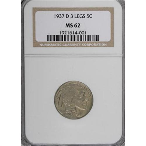 <B>1937-D 5C Three-Legged MS62 NGC.</B></I> While the surfaces show no trace of friction, the highpoints of the design display the usual loss of definition seen on most Three-Legged nickels. This particular coin has subdued luster, and each side is pearl-gray with slight undertones of golden and rose. The only mark of note is a shallow, vertical planchet lamination behind the mouth of the Native American.<BR><BR><B>Coin Engraver:</B> James E. Fraser<BR><BR><b>Shipping:</b> Coins & Currency (<a target="_blank" href="http://www.heritageauctions.com/common/shipping.php">view shipping information</a>)