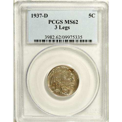 <B>1937-D 5C Three-Legged MS62 PCGS.</B></I> FS-020.2. Orange, lilac, and pearl-gray shades embrace this shimmering and boldly impressed Buffalo nickel. Well preserved aside from a hair-thin mark just above the Indian's braid. The 1937-D Three-Legged nickel is one of the two most notable die polishing errors in U.S. numismatics, along with the 1922 No D cent.<BR><BR><b>Shipping:</b> Coin/Currency (<a target="_blank" href="http://www.heritageauctions.com/common/shipping.php">view shipping information</a>)