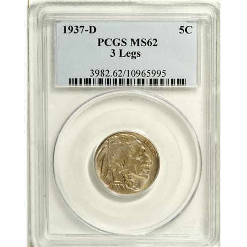 <B>1937-D 5C Three-Legged MS62 PCGS.</B></I> FS-020.2. Tawny-gold and sky-blue tints endow this lustrous and generally smooth key date nickel. The strike is crisp, and the eye appeal is undeniable. A thin vertical mark is concealed left of the front leg. A worthy example of the perennial collector favorite.<BR><BR><b>Shipping:</b> Coin/Currency (<a target="_blank" href="http://www.heritageauctions.com/common/shipping.php">view shipping information</a>)