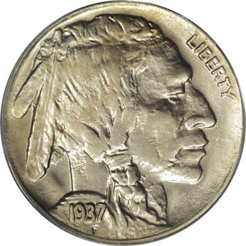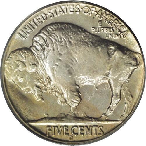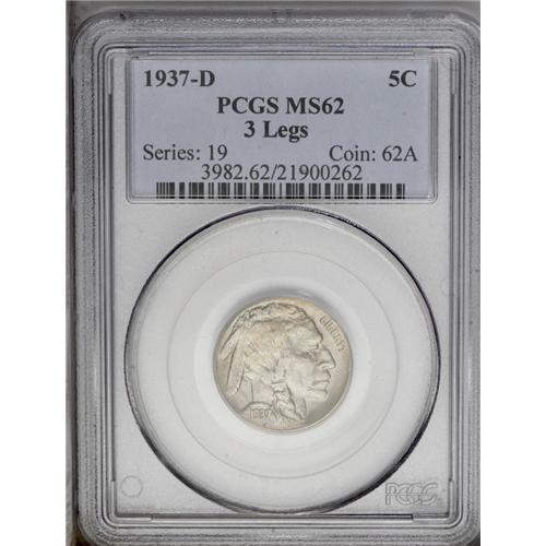 <B>1937-D<5C> Three-Legged MS62 PCGS.</B></I> Lustrous light gray surfaces are enhanced by traces of gold color on each side of this pleasing Mint State example. The Three-Legged Buffalo nickel has been highly sought for several decades since its discovery. Although technically a die state and not a separate variety, it has become an integral part of a complete collection of Buffalo nickels.