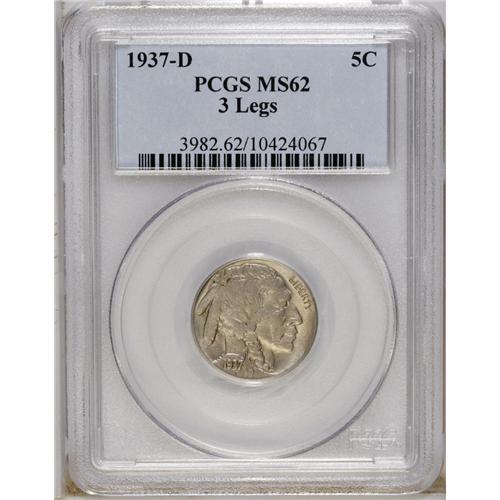 <B>1937-D 5C Three-Legged MS62 PCGS.</B></I> The luster is somewhat diffused due to the advanced die erosion always seen on this issue; most pieces lack more than rudimentary luster. The surfaces are strictly Mint State, however, without the slightest trace of rub, and even under a loupe the surfaces are appealing and problem-free. Light silver-gold patina evenly covers each side. An appealing mid-Mint State example.<BR><BR><b>Shipping:</b> Coin/Currency (<a target="_blank" href="http://www.heritageauctions.com/common/shipping.php">view shipping information</a>)
