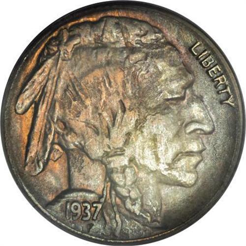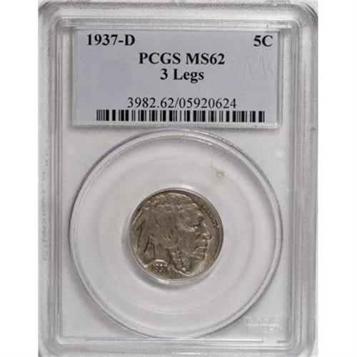 <B>1937-D 5C Three-Legged MS62 PCGS.</B></I> The Three-Legged nickels have been collector favorites since their discovery, with the 1937-D leading the herd. Mint State examples such as the present piece are particularly popular. The strike is solid by the standards of the issue, though the braid and shoulder show a degree of the usual softness. Rich silver-blue and peach toning drapes luminous, lightly abraded surfaces. Excellent visual appeal for the grade.<BR><BR><B>Coin Engraver:</B> James E. Fraser<BR><BR><b>Shipping:</b> Coins & Currency (<a target="_blank" href="http://www.heritageauctions.com/common/shipping.php">view shipping information</a>)