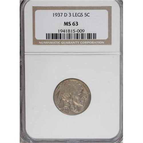 <B>1937-D 5C Three-Legged MS63 NGC.</B></I> FS-020.2. A gently shimmering example with moderate caramel-gold patina. Only inconsequential contact is detected, and the strike is crisp for the series, particularly on the Indian's braid. Long regarded as a key date, the 1937-D Three-Legged nickel ranks as one of the most famous die polishing errors in numismatics.<BR><BR><B>Coin Engraver:</B> James E. Fraser<BR><BR><b>Shipping:</b> Coins & Currency (<a target="_blank" href="http://www.heritageauctions.com/common/shipping.php">view shipping information</a>)