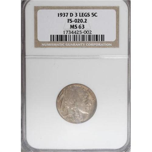 <B>1937-D 5C Three-Legged MS63 NGC.</B></I> FS-020.2. This lustrous key date nickel is bathed in honey-gold and lilac-red toning. Careful inspection reveals only trivial contact. The strike is precise, particularly on the diagnostic trail of tiny die dots beneath the bison's flank. Along with the 1922 No D, Strong Reverse cent, the most widely collected die abrasion error.<BR><BR><B>Coin Engraver:</B> James E. Fraser<BR><BR><b>Shipping:</b> Coins & Currency (<a target="_blank" href="http://www.heritageauctions.com/common/shipping.php">view shipping information</a>)