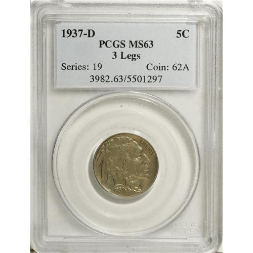 <B>1937-D 5C Three-Legged MS63 PCGS.</B></I> The Three-Legged variety of the 1937-D Nickel usually doesn't grade any better than XF. This is a very nice Mint State coin that has original, satiny surfaces that are argent-gray overall with strong underlying crimson-rose iridescence. This piece shows a typically soft strike near the centers on both obverse and reverse, but is actually much sharper than average near the peripheries. There is a mark on the Indian's lower jaw on the obverse, while a few trivial abrasions are seen on the reverse. A grainy orange-peel texture is common throughout, the result of heavy die erosion. A solid Mint State representative of this ever-popular variety.<BR><I>From The Park Cities Collection.</B></I><BR><BR><b>Shipping:</b> Coin/Currency (<a target="_blank" href="http://www.heritageauctions.com/common/shipping.php">view shipping information</a>)