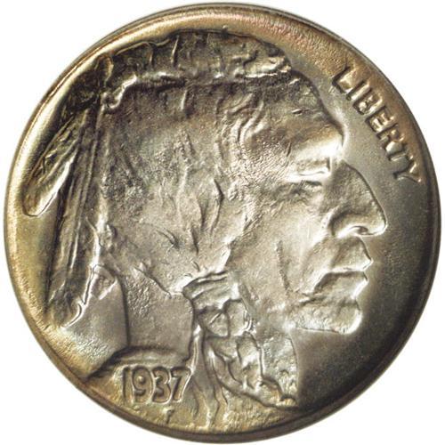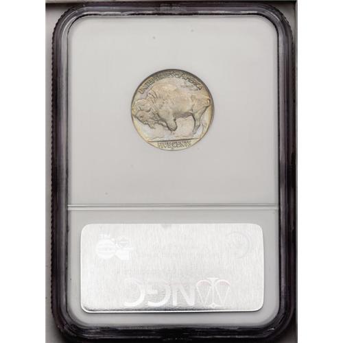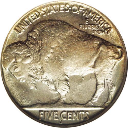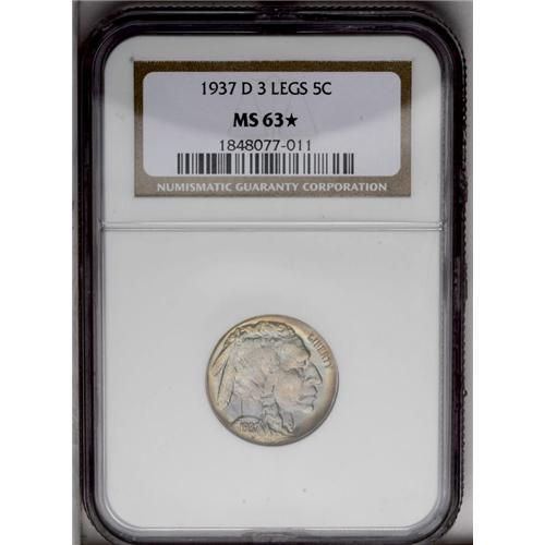 <B>1937-D<5C> Three-Legged MS63 <img border='0' src='http://www.heritagecoins.com/images/star.gif' width=10 height=10> NGC.</B></I> A lustrous and crisply struck example, exceptionally clean for the grade and deserving of bidder inspection. A pleasant mixture of ice-blue, pink, antique-gold, and argent-gray patina blankets each side. The diagnostic trail of tiny die lumps in the field between the legs is present. There are no mentionable marks or carbon spots.
