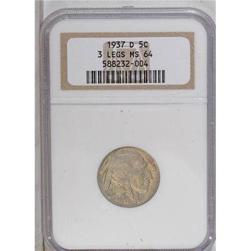 <B>1937-D<5C> Three-Legged MS64 NGC.</B></I> FS-020.2. A famous and ever-popular die variety, resulting from overzealous die polishing by a Mint employee. The detail of one of the Buffalo's front legs was obscured, hence the nickname "Three-Legged." Mint State pieces are highly sought after by collectors, as most of the known examples were released into circulation. This near-Gem is one of the best-preserved pieces that this cataloger has ever seen. Both sides seem entirely free of even small marks or blemishes of any kind. The striking details are bold and even, and the coin displays a pleasing blend of gold and pastel olive patina. The luster is just a bit weak, perhaps preventing an even loftier grade assessment.<BR><I>From The Clifton Rodenburg Collection.</B></I>