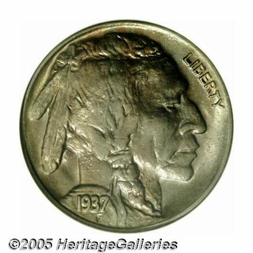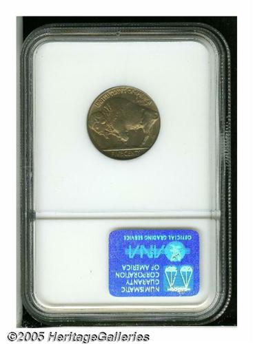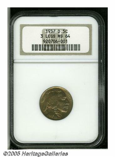 <B>1937-D<5C> Three-Legged MS64 NGC.</B></I> There is much to recommend about this exceptional Mint State example. First of all, the strike is particularly well executed for a Three-Legged Buffalo, and the satiny surfaces are highlighted in sky-blue and reddish-orange pastel toning that gives the coin a terrific, original appearance. Other than a couple of tiny abrasions, there are no post-striking distractions or often-present carbon spots. A remarkably well preserved example.