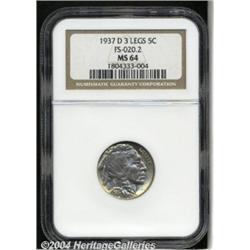 <B>1937-D<5C> Three-Legged MS64 NGC.</B></I> FS-020.2. Usually found in VF to AU grades, and very rarely in Mint State. The reason for relatively few Uncirculated survivors may be that most deliveries of the as-yet-unnoticed variety were reportedly made to banks in Montana, where coin collectors were scarce, with most specimens thus reaching circulation. This near-Gem example shows pale violet color in the centers surrounded by light golden toning around the borders, and sharply struck design elements. A few small, obscure marks prevent a higher grade. <BR><BR><B>Important notice:</B> Heritage usually auctions material at the rate of 200-250 lots per hour. On some occasions eBay Live bid software or the Internet may not be able to keep up with the pace of the auction. We recommend placing a realistic absentee bid now as insurance to avoid disappointment. Occasionally the auctioneer may eliminate or reject an eBay Live bid, and the auctioneer may also reopen a lot after the close of the eBay live bidding (usually because we missed an audience bid), and may reject your bid even if it shows you as the winning bidder. By bidding via eBay Live, you agree that Heritage may award the lot to another bidder at its sole discretion under the circumstances described above or any other reasonable circumstances. Since eBay bids are not shown to us until we open the lot on the floor, we treat those bids just like floor bids. In most cases the floor responds before the eBay bid is presented to us, due to Internet lag time, so for consistency we have made it a policy that floor bids are always considered first over tie eBay live bids. Also please note that all Heritage lots purchased through eBay Live carry a 20% Buyer's Premium. Please make sure you read the Terms and Conditions before you bid. </span></font></tr></table></td></tr></table>