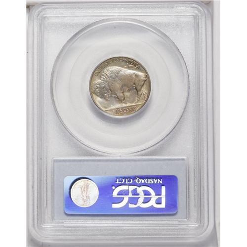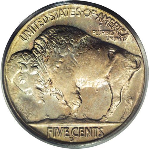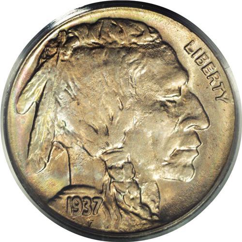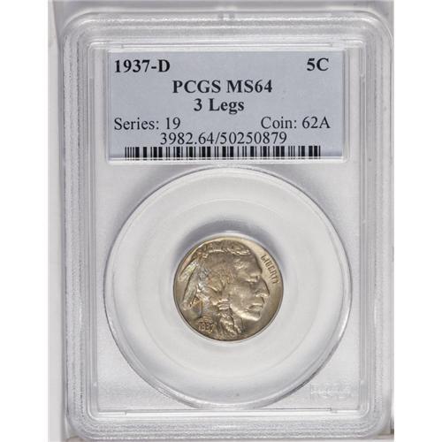 <B>1937-D<5C> Three-Legged MS64 PCGS.</B></I> This is a near-Gem with impressive eye appeal. Both sides are replete with frosty luster. Light gold color covers both surfaces with splashes of pale blue and peripheral iridescence. A sharply struck specimen, although the usual minor weakness is evident at the center on each side. This example has all of the characteristics of the genuine three-legged die state, with a trail of light die dots curved beneath the bison's flank. The entire animal is slightly smaller in stature, well away from the motto E PLURIBUS UNUM. The 1937-D Three-Legged nickel is one of the few issues known to most casual collectors, along with other famous items as the 1909-S VDB cent and the 1804 dollar.