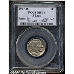 <B>1937-D<5C> Three-Legged MS64 PCGS.</B></I> This unique variety was the result of a mint workman refinishing the die to remove clash marks. He got carried away in his work and removed a little too much of the reverse die, including the Buffalo's front right leg. During this same process, the actual size of the Buffalo was somewhat diminished. Additional die wear created erosion that appears as a rough appearance to the Buffalo's hind-quarter and rear legs. This has sometimes been described as a "moth-eaten" appearance. All of these characteristics are excellent identification points for authenticity. This example is quite sharply struck and exhibits light gold toning on the obverse with pale gray and iridescent coloration on the reverse. A couple of small marks on the reverse are all that keep this from Gem quality. <BR><BR><B>Important notice:</B> Heritage usually auctions material at the rate of 200-250 lots per hour. On some occasions eBay Live bid software or the Internet may not be able to keep up with the pace of the auction. We recommend placing a realistic absentee bid now as insurance to avoid disappointment. Occasionally the auctioneer may eliminate or reject an eBay Live bid, and the auctioneer may also reopen a lot after the close of the eBay live bidding (usually because we missed an audience bid), and may reject your bid even if it shows you as the winning bidder. By bidding via eBay Live, you agree that Heritage may award the lot to another bidder at its sole discretion under the circumstances described above or any other reasonable circumstances. Since eBay bids are not shown to us until we open the lot on the floor, we treat those bids just like floor bids. In most cases the floor responds before the eBay bid is presented to us, due to Internet lag time, so for consistency we have made it a policy that floor bids are always considered first over tie eBay live bids. Also please note that all Heritage lots purchased through eBay Live carry a 20% Buyer's Premium. Please make sure you read the Terms and Conditions before you bid. </span></font></tr></table></td></tr></table>