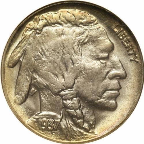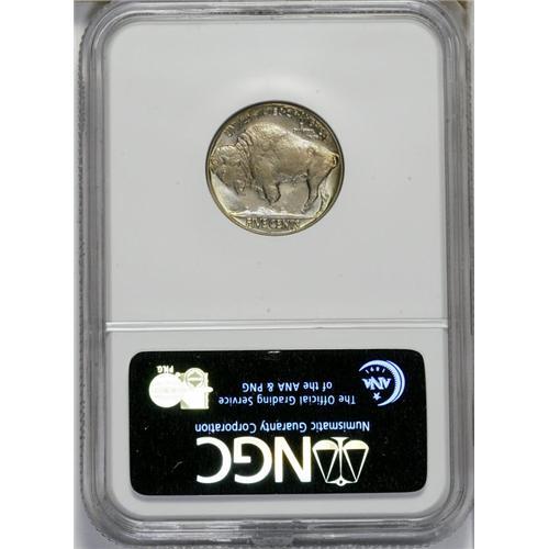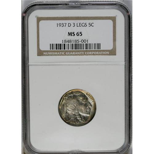 <B>1937-D<5C> Three-Legged MS65 NGC.</B></I> An important part of any Buffalo nickel collection is the popular and intriguing 1937-D Three-Legged variety, created when a Mint workman was refinishing a reverse die to remove clash marks. Clash marks occurred when the obverse and reverse dies literally struck each other without an intervening planchet. When the clashing accident took place, one of the dies (and sometimes both dies) would pick up parts of the design details from the opposing die. After that, every coin struck from the clashed dies would show these additional, unwanted details. During their lifetime, these dies would be removed from the press for refinishing, sometimes called lapping or polishing. The process would remove a microscopically thin layer of the die surface, just enough to eliminate the clash marks. Of course, a slight loss of design details also occurred. If the repolishing was carried even slightly too far, the loss of design details would be clearly visible. That is precisely what happened here, where the repolishing process removed the bison's front leg, one of the shallowest points in the reverse die.<BR> This example is a remarkable Gem, approaching the finest in existence. Both sides have fully lustrous and frosty gray surfaces with pale gold, blue, and lilac color on each side, including a rainbow presentation near the border. Census: 41 in 65, 15 finer (6/06).