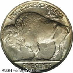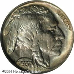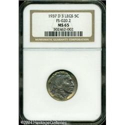 1937-D 5C Three-Legged MS65 NGC. FS-020.2. Bands o <B>1937-D 5C Three-Legged MS65 NGC.</B></I> FS-020.2. Bands of rose and lemon color grace the peripheries, while the centers are filled with rich powder-blue, apricot, and lilac hues. A crisply struck and attractively preserved Gem. The most famous of several issues available with missing portions of the bison's foreleg, which is in low relief and hence is readily removed from a reverse die when it is polished to remove clash marks. Although VF to XF examples (often with problems) are always available, lofty Mint State examples of this popular <I>Guide Book</B></I> variety are rare. Population: 33 in 65, 13 finer (6/04). <BR><BR><B>Important notice:</B> Heritage usually auctions material at the rate of 200-250 lots per hour. On some occasions eBay Live bid software or the Internet may not be able to keep up with the pace of the auction. We recommend placing a realistic absentee bid now as insurance to avoid disappointment. Occasionally the auctioneer may eliminate or reject an eBay Live bid, and the auctioneer may also reopen a lot after the close of the eBay live bidding (usually because we missed an audience bid), and may reject your bid even if it shows you as the winning bidder. By bidding via eBay Live, you agree that Heritage may award the lot to another bidder at its sole discretion under the circumstances described above or any other reasonable circumstances. Since eBay bids are not shown to us until we open the lot on the floor, we treat those bids just like floor bids. In most cases the floor responds before the eBay bid is presented to us, due to Internet lag time, so for consistency we have made it a policy that floor bids are always considered first over tie eBay live bids. Also please note that all Heritage lots purchased through eBay Live carry a 20% Buyer's Premium. Please make sure you read the Terms and Conditions before you bid. This lot is being auctioned in conjunction with a live floor auction by Heritage Galleries & Auctioneers. All final auction and invoice information will be supplied by Heritage Galleries & Auctioneers, and all other information should be considered preliminary. Lot:5615