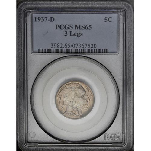 <B>1937-D<5C> Three-Legged MS65 PCGS.</B></I> A lovely Gem example of this rare and popular variation with light gold toning on both sides. Pale blue and lilac color add to the aesthetic appeal of this important piece. The present sale has a dozen examples of this variety, ranging in grade from this Gem specimen down to several circulated examples. Collectors are certainly presented with a range of choices to fill this spot. Although merely a die state, this variety has been recognized for many years via its listing in the <I>Guide Book.</B></I> <BR><BR><B>Important notice:</B> Heritage usually auctions material at the rate of 200-250 lots per hour. On some occasions eBay Live bid software or the Internet may not be able to keep up with the pace of the auction. We recommend placing a realistic absentee bid now as insurance to avoid disappointment. Occasionally the auctioneer may eliminate or reject an eBay Live bid, and the auctioneer may also reopen a lot after the close of the eBay live bidding (usually because we missed an audience bid), and may reject your bid even if it shows you as the winning bidder. By bidding via eBay Live, you agree that Heritage may award the lot to another bidder at its sole discretion under the circumstances described above or any other reasonable circumstances. Since eBay bids are not shown to us until we open the lot on the floor, we treat those bids just like floor bids. In most cases the floor responds before the eBay bid is presented to us, due to Internet lag time, so for consistency we have made it a policy that floor bids are always considered first over tie eBay live bids. Also please note that all Heritage lots purchased through eBay Live carry a 20% Buyer's Premium. Please make sure you read the Terms and Conditions before you bid. This lot is being auctioned in conjunction with a live floor auction by Heritage Galleries & Auctioneers. All final auction and invoice information will be supplied by Heritage Galleries & Auctioneers, and all other information should be considered preliminary. Lot:1140 <BR><BR><B>Winning Notification and Billing:</B> After the FINAL session in this auction is complete, Heritage will send e-mail and snail mail invoices. This process normally takes several days. All final auction and invoice information will be supplied by Heritage Galleries & Auctioneers, and all other information should be considered preliminary. <BR><BR>This auction will be conducted on a live auction floor and over the Internet through eBay Live. If you choose to place an absentee bid, please take a moment to <font color='#0000ff'><u><a href='http://pages.ebay.com/liveauctions/help/before/laabsentee.html'>learn how eBay Live absentee bidding works</a></u></font><font color='#000000'>