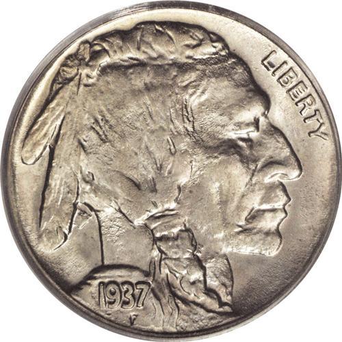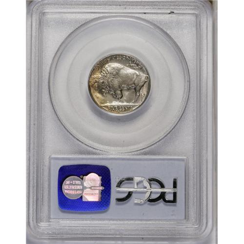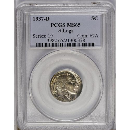 <B>1937-D<5C> Three-Legged MS65 PCGS.</B></I> A numismatically interesting and famous variety, resulting from overzealous die polishing by a mint employee (Mr. Young), to remove marks from a severely clashed die. The detail of one of the Buffalo's front legs was rubbed away; hence the term "Three-Legged." Mint State specimens are highly sought after by collectors, as most known examples were released into circulation. This coin is one of the finest this cataloger has ever seen. Lovely hues of sky-blue, lime-gray, and tan are noticed on the obverse; the reverse is mostly sunset shades of red, magenta, and gold near the leftside border, with bright blue-green toning to the right. The strike is very bold and uncommonly sharp for this rare issue. The surfaces seem immaculate. It is hard to imagine a finer example of this immensely popular variety, which is quite well known even outside of numismatic circles. Population: 44 in 65, 4 finer (6/06).<BR><I>From The New York Eye Appeal Collection.</B></I>
