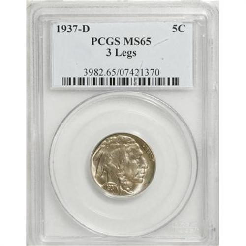 <B>1937-D 5C Three-Legged MS65 PCGS.</B></I> From Aubrey Bebee's 1939 "buffalo hunt" in Montana to Walter Breen's apocryphal novice coiner, Mr. Young, few modern coins have accumulated as much lore and legend as the popular 1937-D Three-Legged nickel. While a piece in any grade draws a crowd of covetous collectors, this important example, coined shortly after the inadvertent design modification, is sure to attract even greater notice. The surfaces have an unusual, distinctly frosty appearance and subtle shades of blue, lavender, and greenish-gold patina. Die erosion is present on each side, albeit in smaller patches than on most such coins, and a number of reverse diagnostics, including the line of dots from the bison's body to the ground, are less pronounced than on most examples; in fact, the tiniest fraction of the missing foreleg is still visible. Though PCGS has graded four finer examples, in terms of eye appeal it seems certain that this Gem would compare favorably to any of them (11/07).<BR><I>From The Madison Collection.</B></I><BR><BR><B>Coin Engraver:</B> James E. Fraser<BR><BR><b>Shipping:</b> Coins & Currency (<a target="_blank" href="http://www.heritageauctions.com/common/shipping.php">view shipping information</a>)