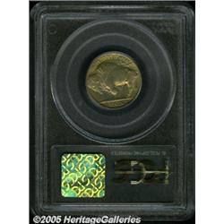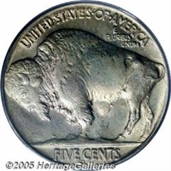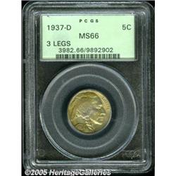 <B>1937-D 5C Three-Legged MS66 PCGS.</B></I> The Three-Legged Buffalo nickel is a coin that has crossover appeal. Technically an error coin, it is now collected as a part of the regular Buffalo nickel series. The coins that are known are all from a single die, and curiously, we know who created this modern rarity. In 1937, a Mr. Young, who was then new to the mint and under pressure to complete a quota of coinage, took an emery stick and ground off evidence of die clashing from a pair of dies. However, in his haste he also inadvertently ground off part of the foreleg of the bison. While lower grade, circulated coins are always available for a price, Uncirculated pieces, especially coins that will fit into a Gem set of Buffalo nickels, are really quite elusive. Only three other MS66 coins have been certified by PCGS with none finer, while NGC has graded 13 with only one finer (2/05).<BR> While known for weak striking details, this is an uncommonly sharp example. The braid on the Indian's hair is strongly defined and there is a faint but definite split in the bison's tail. Only the matted hair on the bison's head shows any trace of weakness. However, what really sets this coin apart from others is the amazing, satiny mint luster and rich olive-gold and lilac iridescent toning that is seen over both obverse and reverse. There are no identifying marks on either side, just a faint grease stain (as struck) in the upper right obverse field below the E in LIBERTY.
