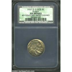 1937-D 5C Three-Legged--Reverse Scratched, Improperly Cleaned--AU Details NCS. FS-020.2. A well struck example of this popular error coin. There is a slight overlay of speckled russet toning on each side which helps subdue the brightness of the cleaned surfaces. A long, shallow scratch covers most of the bison on the reverse. Important notice: We expect to be auctioning lots at the rate of 200-250 per hour. On occasion eBay live bid software cannot keep up with the pace of the auctions where 4-5 lots per minute can hammer down, so we recommend that you place a realistic absentee bid now as insurance to avoid disappointment. Also please note that all Heritage/CAA lots purchased through eBay Live carry a 20% Buyer's Premium. Please make sure you read the Terms and Conditions.