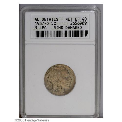 1937-D 5C Three-Legged--Rims Damaged--ANACS. AU Detail 1937-D[5C] Three-Legged--Rims Damaged--ANACS.