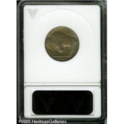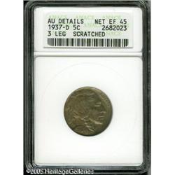 <B>1937-D 5C Three-Legged--Scratched--ANACS. AU Details, Net XF45.</B></I> Rose and gray patina occupies each side of this popular variety, as do several short, shallow scratches. A scrape is also apparent in the middle of the longest feather. Lot:6039