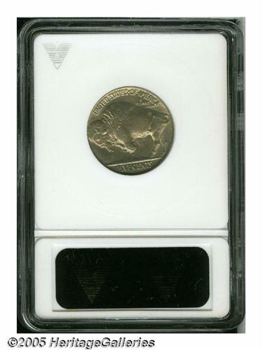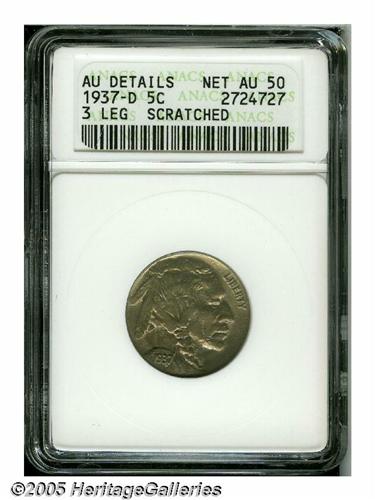 <B>1937-D<5C> Three-Legged--Scratched--ANACS. AU details, Net AU50.</B></I> Tan-rose surfaces retain nice luster, and exhibit well defined design elements. A couple of short and shallow scratches are well concealed within the Indian's hair near the temple, and a couple of more are located on the temple and on the bison above the left leg. Sounds worse than it really is, and would fit relatively well into a circulated Buffalo nickel collection.