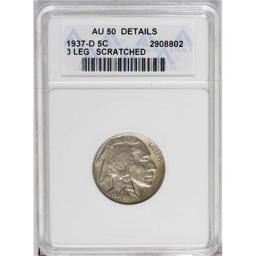 <B>1937-D<5C> Three-Legged--Scratched--ANACS. AU50 Details.</B></I> Pale gold-gray toning covers much of this mildly worn coin. A long, thin scratch affects the Indian's hair, but this piece is perfectly suited for reverse display.